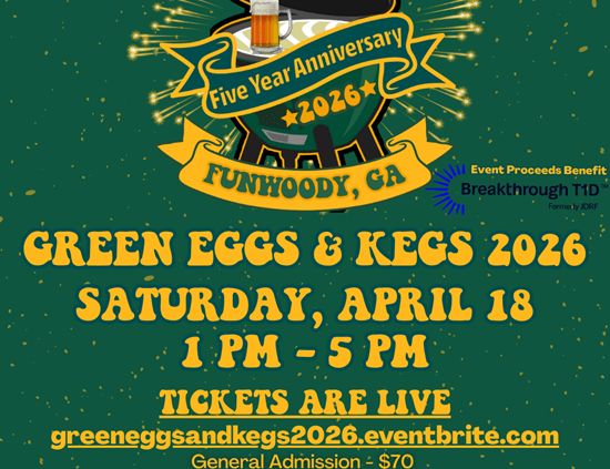 Proceeds from Green Eggs & Kegs benefit BreakthroughT1D (formerly JDRF), supporting research and advocacy for type 1 diabetes. The event is made possible through the generous support of sponsors including Big Green Egg, Discover Dunwoody, Regency Centers, Sysco, Create Dunwoody, Ace Hardware – Dunwoody, VGASS, Functionize Health, Dunwoody Gallery, Organic Solutions, Mix & Meld Permanent Jewelry, United Distributors, Empire Eagle Rock, Georgia Crown, RNDC, Regency Centers, and more.