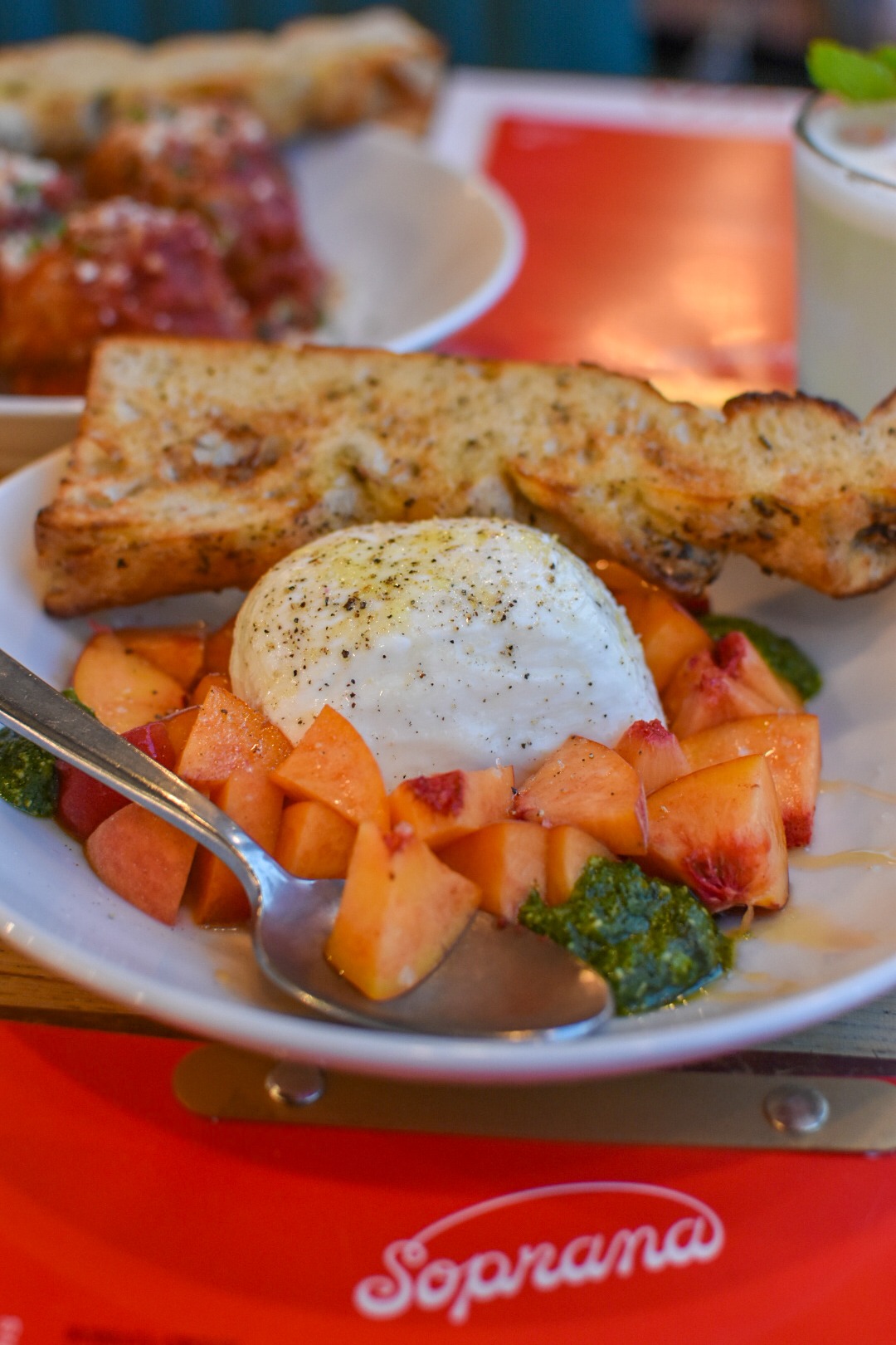 And wait until you see the gorgeous rooftop bar, which is the spot for pizza and views in downtown Asheville, Soprana Rooftop Cocina. It is a gorgeous Italian cucina with sweeping mountain views! Once I saw the space, I was super excited to try it, and it was one of the best meals experiences all weekend! They have staple Italian fare, an extensive brick-oven pizza list, a fun creative cocktail menu, wines, all set to the mountains in the background! To my surprise my favorite dish is the burrata. I do like burrata, but this one was sensational! Think cool and mild cheese encased in a mild cheese shell then served with fresh, local, sweet, ripe peaches and the best earthy yet herbaceous pesto! The entire bite was a flavor train.