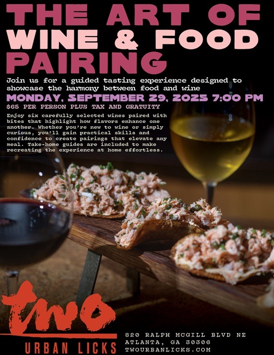 Ever wonder why fish pairs so naturally with crisp white wines or why a bold red brings out the best in steak? TWO urban licks is breaking down the fundamentals of pairing during a guided tasting on Monday, September 29 at 7 p.m. Guests will explore six distinctive wines alongside small bites from Executive Chef Chad Clevenger, each combination chosen to highlight how flavors complement and contrast. The evening will blend education with enjoyment, giving participants practical tips and take-home pairing guides to recreate the experience with confidence at home. Tickets are $65 per person, plus tax and gratuity, and can be reserved by texting or calling 404.500.8731. A staple in Atlanta’s dining scene for over 20 years, TWO urban licks is located at 820 Ralph McGill Boulevard NE in Atlanta, Georgia, serving dinner nightly and brunch on weekends. For reservations and more information, call 404.500.8731 or visit twourbanlicks.com. Stay connected on Instagram @twourbanlicks, Twitter @twourbanlicks, and Facebook at facebook.com/TWOurbanlicks.