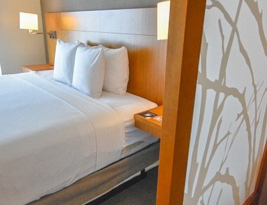 Up in the rooms, you walk into a spacious seating area with full comfy couch. The bathroom is on the way in as well and has a large walk-in shower. The large king bed is one of the most comfy and I need to know where to buy some of their pillows! The best part was our view of the roof of the Georgia aquarium and the Atlanta downtown skyline! Wow!