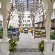 Before you even enter, this hotel feels like Europe, a mixture of old and new architecture, arches, and stucco. A spiral staircase and awning wind up to the landing where Spanish and European style tile spell out the word Granada. The centerpiece of the Hotel is the courtyard just through an archway! A centerpiece fountain is surrounded by groups of seats where it would be perfect to hang out in during spring with a cocktail from Pom Court.
