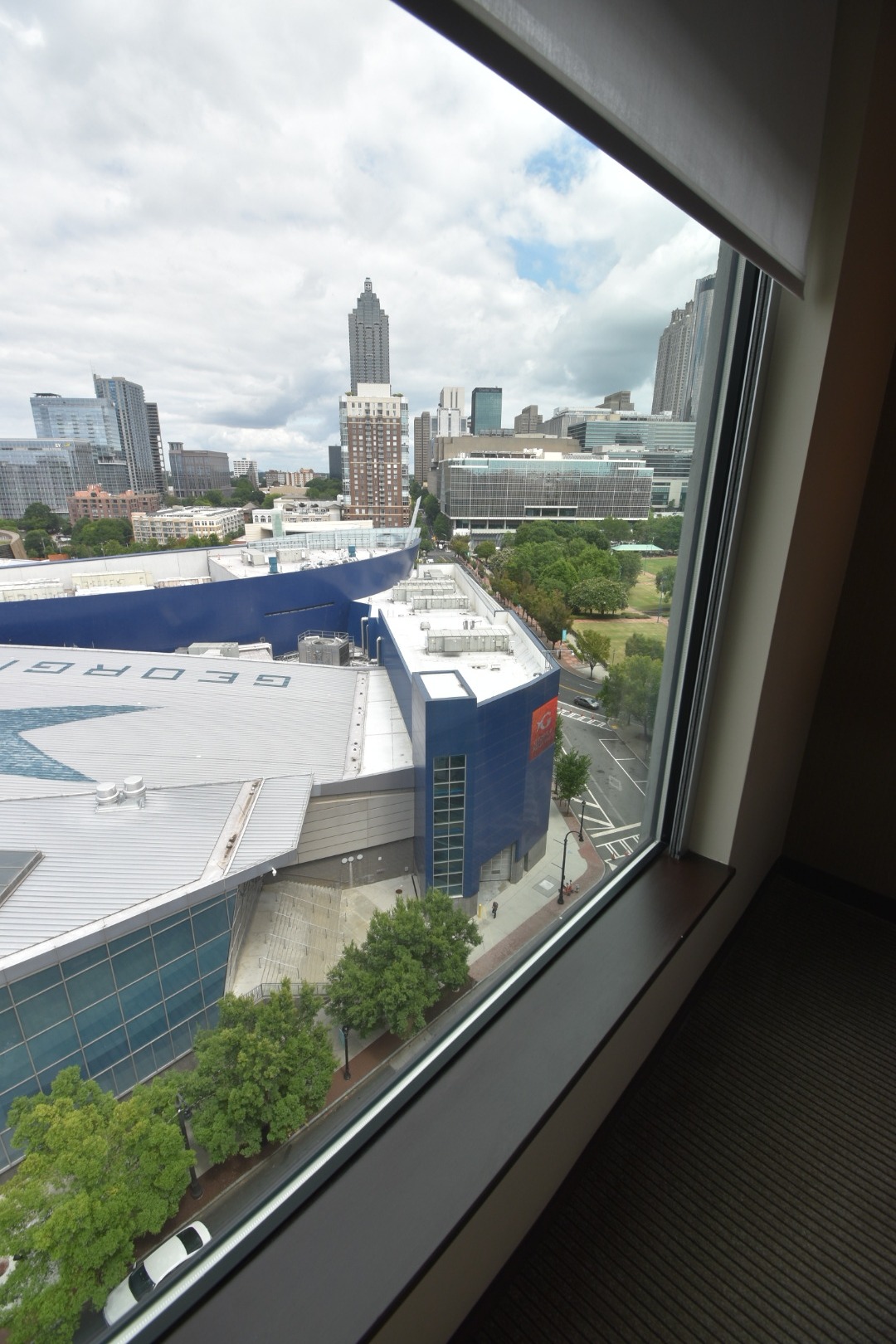 Up in the room, I could not get over how calming the spacious room we stayed in! They provide ultimate comfort and the finest touches. It was calming off white with classy furniture, and sleek lines. I really loved the wardrobe; glass and metal and open with a laundry bag hanging if you need. In the bedroom, the large bed is sprawling and comfortable, the sound of water is played as you enter. The bed design and headboard are modern yet simple with gorgeous metal, clean lighting. The bathroom is also a stunner! There is a large vanity, and round mirror reflects off the glass shower. The best part of the shower is the rainfall shower head with its gentle, soothing in-room spa!