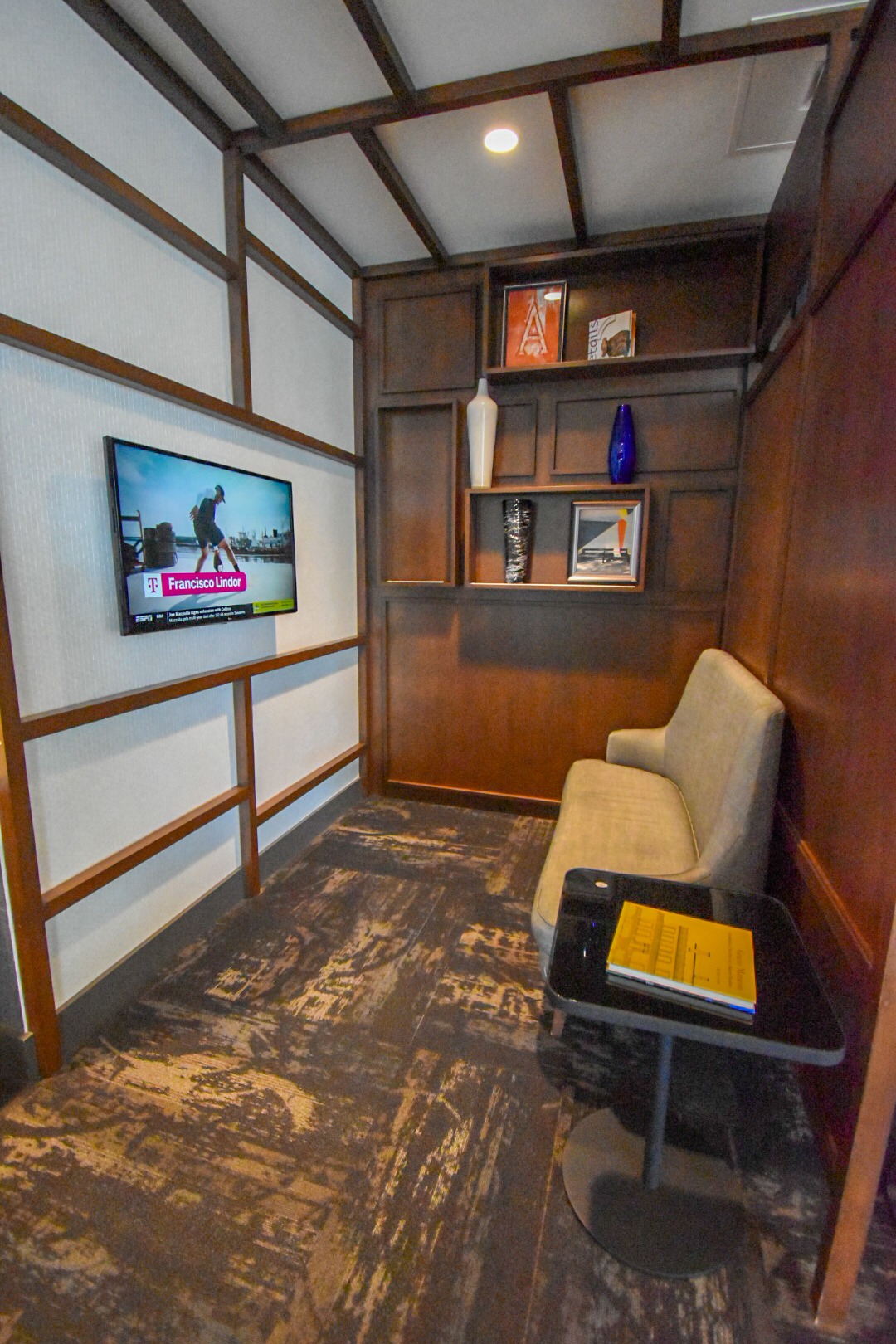 In the lobby, you are greeted with a lush seating area between the automatic doors, and in front of you is a table decked out in skincare, large flowers, with a large steel light. The check-in area is 20s deco lines, minimalistic with the word ette small and unobtrusive. Flanking each side of the check in are cozy, clean sitting areas with pops of purple color couches, piano, and skincare bookcase! I am in love with the mural outside the spa with the girl decked out in royal clothing taking a modern selfie!