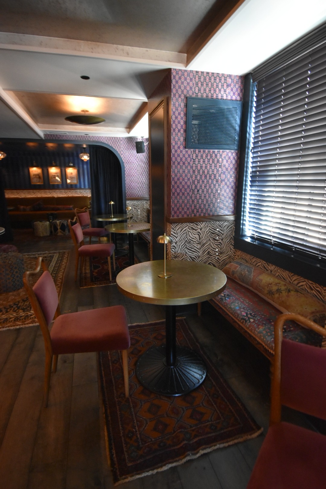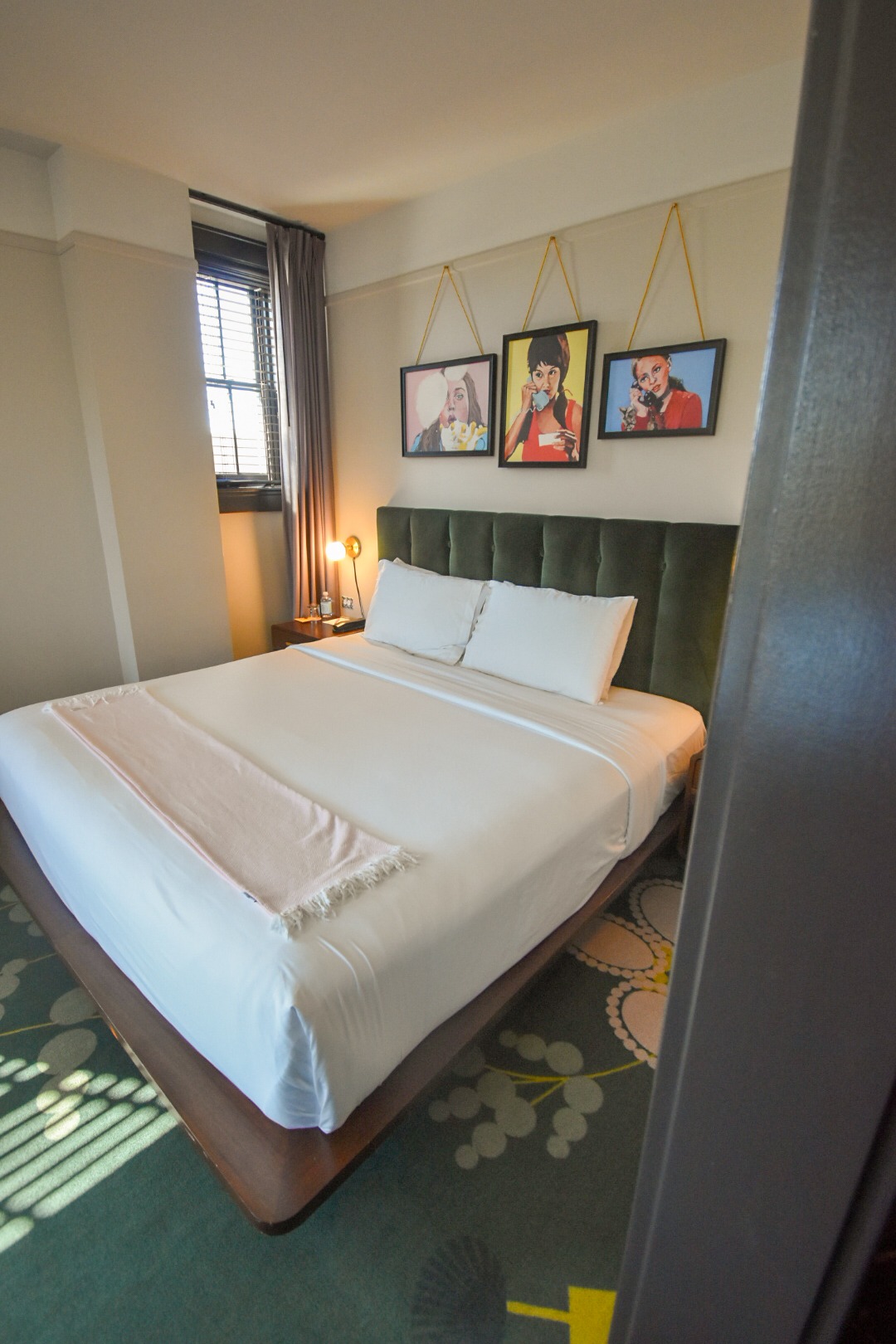 In the rooms, we walked up a brooding original marble hallway to a spacious king corner room on the 3rd floor. Down a short moody blue hallway to a large king bed with green velvet headboard and a pop of pop art above. The carpet is a funky asymmetrical floral pattern leading to the lounging chaise and desk. In the bathroom, marble floors stun and juxtapose the beautiful blue-green wallpaper filled with birds!